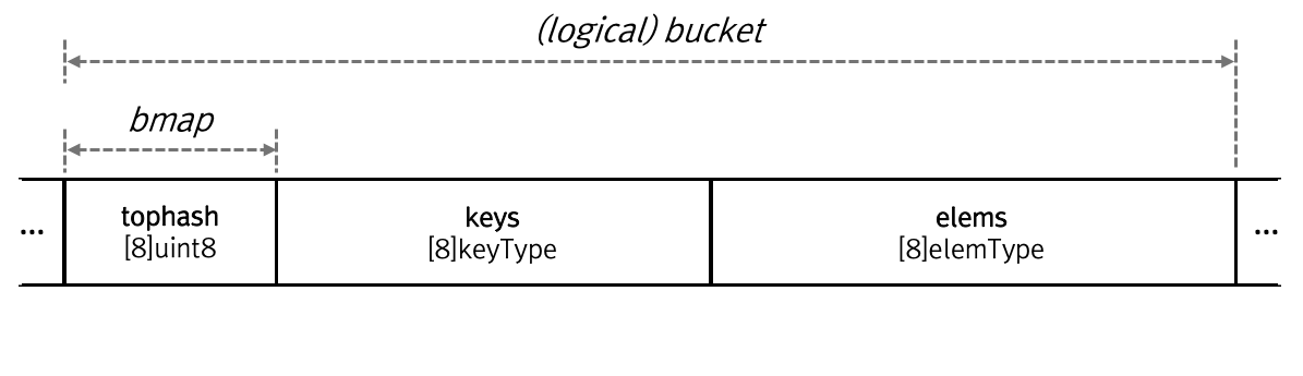 그러나 Go에는 generic이 없으니 (1.18 이전) 위와 같은 개념과는 다르게 런타임을 구현해야했다. (Generic이 도입된 1.18에도 런타임에서 맵의 구현은 변경되지 않았다.)