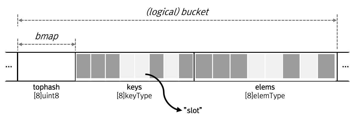 이전에 bmap과 mapaccess 과정을 살펴볼 때 Go에서의 해시테이블은 Linked List가 아니라 버킷마다 8개의 슬롯을 가진 Array를 미리 할당하여 chaining을 구현한다고 소개했다.